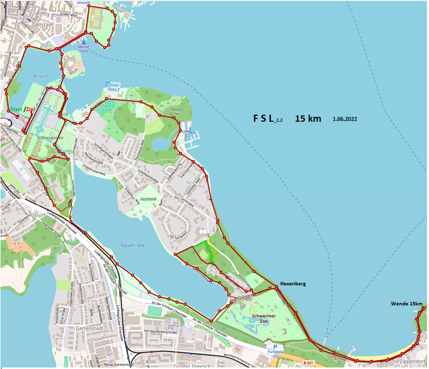 Start am Bertha-Klingberg-Platz - Burgseepromenade - über Werderstraße Marstallhalbinselumrundung - am Schloss vorbei bis zum Beginn Franzosenweg - Franzosenweg bis hinter Zippendorf - Wende in Höhe des ehemaligen SED-Gästehauses - zurück auf dem Franzosenweg bis Abzweig hinter dem Zoo – Hexenberg hoch zum Waldschulweg (Alter Zooeingang) – auf unterem Waldschulweg und Querungspfad zum Funkhauszaun – nach links Richtung Zoogaststätte – Passage Rastplatzdreieck – zur Südseite Fauler See bis Anfang Lennèstraße – über Auffahrt „Radeberger“ und Wanderweg zur Stellingstraße – an Freilichtbühne vorbei auf Schleifmühlenweg zum Abzweig Pflasterweg – im Schlossgarten über Kreuzkanalbrücke auf den Birkenweg - Lennèstraße zur Burgseestraße - Ziel am Bertha-Klingberg-Platz / Schwimmende Wiese